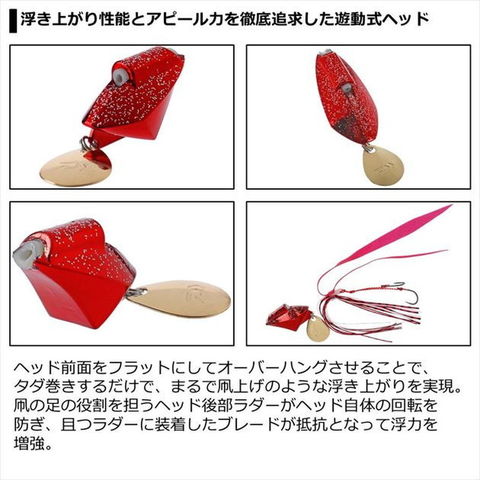 狙える魚種は無限大。ショアラバゲーム用遊動式キャスティングラバージグ。ヘッド全面をフラットいしてオーバーハングさせることで、タダ巻きするだけで、まるで凧上げのような浮き上がりを実現。凧の足の役割を担うヘッド後部ラダーがヘッド自体の回転を防ぎ、且つラダーに装着したブレードが抵抗となって浮力を増強。