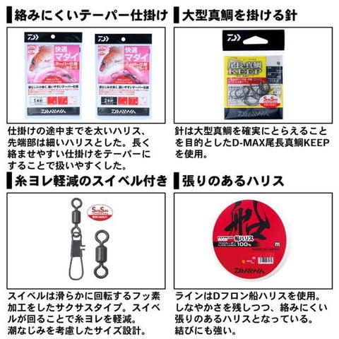 ハリ数:1 ハリサイズ:10号 ハリス号数:4号 幹糸号数:7号 ハリス/幹:6/9m 中間スイベル:2号 入数:1 好評の快適マダイ仕掛けにシリーズにテーパー仕掛け追加 ■大型マダイに実績が高いマダイテーパー仕掛けがラインアップに追加。10m以上の長い仕掛けの場合ハリスが細いと手前まつりが起こりやすいが、仕掛けの途中まで太いハリスで先端部は細いハリスとすることで扱いやすい仕掛けとし、接続部は驚異の回転力サクサススイベルを使用した糸よれにも強い仕掛けです。■針は新型のD-MAX尾長真鯛SSを使用。エサがつけやすいロングシャンク、針先がネムっているのでマダイのカンヌキを確実にとらえる設定。※掲載している商品の画像は代表画像を表示しています。また実物と色が違って見える場合があります。あらかじめご了承下さい。