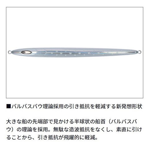 スーパーディープも制するセミロングタイプのスロージグ。中深海におけるスロージギングシーンにおいて、特に強烈な水圧とその中で安定したジャークを繰り出す為には、アングラーの負荷を出来るだけ抑えたいという要望をうけて開発。セミロングタイプの形状に加え、スーパーディープを意識したことから、水を受ける先端部分の形状を半球状にし造波抵抗を軽減した、バルバスバウ理論搭載の入魂の逸品。さらに安定したジャーク&フォールを繰り出す為に細部にわたり細かい削り込みをフィールドで施し、同船したスロージギングの名手をもうならせたことも付けさせていただきたい。全長:205mm