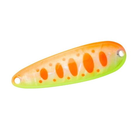 長い歴史を経て、今なお色褪せない実力を発揮するスプーンの代名詞。ネイティブトラウト狙いに欠かせない定番スプーン。数々のテストを経て「釣れるカラー」を厳選。長さと幅の好バランス、適度な肉厚を備えた形状は実にスタンダードなシェイプでクラシックタイプとも呼ばれる。特にテールのカップが深いため、流れをよくつかむことができ、非常に大きなアクションを発生させる。止水~河川のほぼあらゆるシチュエーションに対応。重量(g):2.5