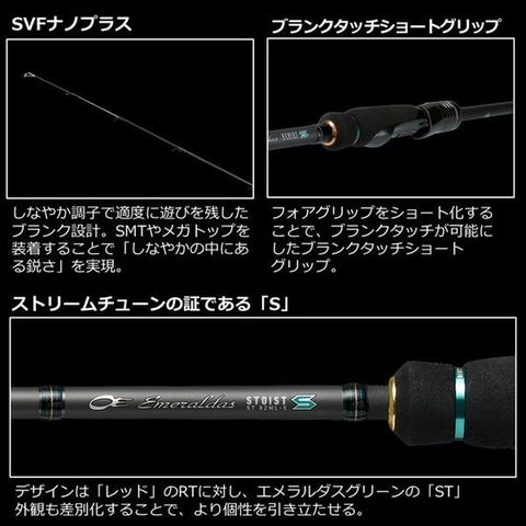 研ぎ澄まされたティップで新感覚に目覚めよ。「STOIST ST(ストリームチューン)」はRT(レーシングチューン)とは対極をなす、しなやかさを重視したモデル。最新テクノロジーにより前作よりも更に軽量に、そして潮流の変化を感じ取りやすい絶妙なティップと調子にチューンを施した。特に繊細なティップはRTとはまた異なる絶妙な感度を備え、エギのフォールやドリフト中の「待ち」を楽しませてくれる、まさに「流れを制す」モデル。■74MMH-SMT・・・前作の「76MMH-SMT」を2インチショート化・及び大幅に軽量化を図ったことで更に操作性が向上した。大型エギを力強くシャクることが出来るハイパワーは健在で、トップには「SMT」(スーパーメタルトップ)を装着しているため様々な情報が手元に集まり、まるでイカがエギを抱くタイミングを伝えてくれるような感覚を得られる。大型狙いはもちろん、小回りも利くロッドなので場所を選ばずに活躍する。
