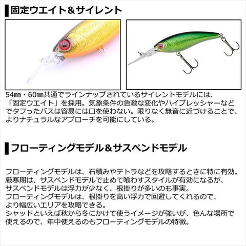 タフコンディションの切り札。ナチュラルアクションシャッド。クランクベイトでもなくミノーでもない、日本で独自の進化を遂げたシャッドプラグ。 ハイプレッシャーエリアでの使用を想定し、過度な動きをを抑えたハイピッチタイトロールアクションと、ベイトフィッシュライクなコンパクトボディで、低活性時のバスにも違和感を与えることなくバイトさせることができます。ローリングとウォブリングが混ざった目まぐるしいアクションはバスに見切られにくく、早巻きでのリアクションの釣りにも対応しています。SR・MR・DRモデルを水深別に使い分け、フローティング・サスペンドモデル、サイレントモデルでアクションやアピール力を調整可能。様々な用途。状況に応じて使い分けが可能なスティーズシャッドは、もはやシャッドプラグの決定版です。