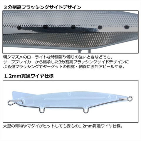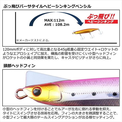 ヒラメ&マゴチからシーバス、青物まで幅広く狙える、超ぶっ飛びのバーサタイルヘビーシンキングペンシル! ★ 自重(g):45 全長(cm):12 タイプ:ヘビーシンキング フック仕様:#4 リング仕様:#4 潜行レンジ(m):60cm~ アクション:ワイドテールスイング ※実物と色が違って見える場合があります。あらかじめご了承下さい。