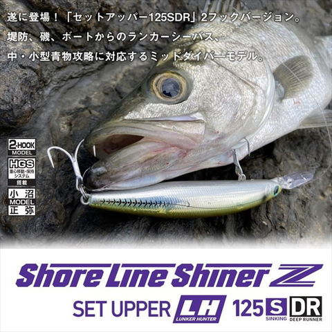 「大物対応の2フック仕様が欲しい」の声をカタチに。ランカーシーバス攻略、堤防青物ゲームに最適な2フック仕様が遂に登場。絶対的信頼感が高い「セットアッパー125S-DR」のボディ、総重量はそのままに、●太軸#3トレブル&#4リング化 ●フック金具の太軸化 ●ボディ内リブ追加により、ランカーシーバス、 中型青物等への耐久性を向上。アクション特性は3フック仕様の125S- DRよりややタイトなウォブンロールながら、ほぼ同感覚でご使用頂ける。セットアッパーの名に恥じないMax77.5mのキャスタビリティと絶妙な不安定感アクション(=食わせの間)を生み出す重心保持システム「HGS(PAT.)」も継承し、ターゲット、状況に応じて、3フック仕様と使い分けて頂くことで、よりターゲットのキャッチ率が向上することだろう。