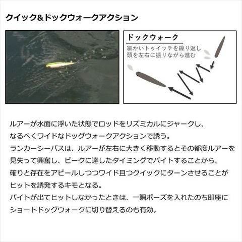 バイトは多いがフッキングが悪い状況に最適な、扱いやすい食べ頃サイズの16cmビッグペンシルが登場!新採用のVハル形状によるクイック&ワイドターンとスーパーラトルサウンドの相乗効果で、スレたランカーシーバスも思わず口を使う!■腹部Vハル形状 ■高浮力ビッグヘッド&立体エラ形状 ■シーバスを寄せるスーパーラトルサウンド ■フッキングを優先した#2トレブルフック&ダブルリング仕様タイプ:フローティング サイズ:160mm 標準自重:51.2g 有効レンジ:水面 アクション:クイック&ワイドドッグウォーク 飛距離:MAX58m、Ave55.6m フック仕様:#2、リング#3 ※実物と色が違って見える場合があります。あらかじめご了承下さい。