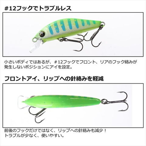 サイズ:40mm 重量:3.0g 標準装備フック:#12ブラックトレブル ※実物と色が違って見える場合があります。あらかじめご了承下さい。