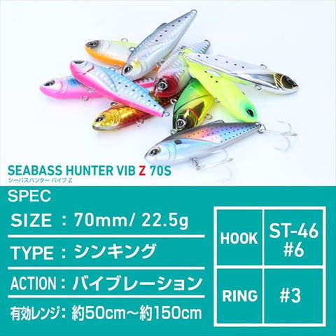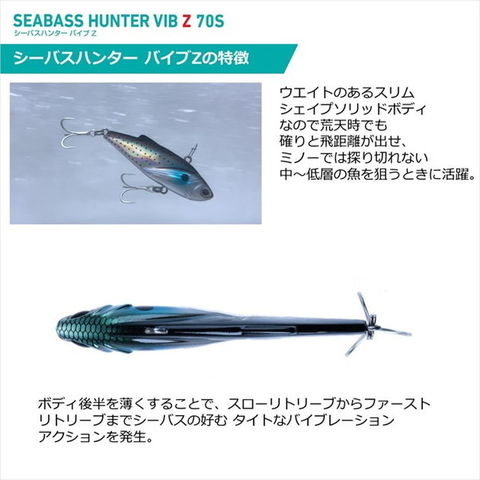 ハイコストパフォーマンスシーバスバイブの定番「シーバスハンターバイブ70S」がZの名を冠して昇華。シーバスはもとよりあらゆるフィッシュイーターに対応するスタンダード「お手軽」バイブレーション。ウエイトのあるスリムシェイプソリッドボディなので荒天時でも確りと飛距離が出せ、ミノーでは探り切れない中~低層の魚を狙うときに活躍。ボディ後半を薄くすることで、スローリトリーブからファーストリトリーブまでシーバスの好むタイトなバイブレーションアクションを発生。使い方は投げて沈めてただ巻くだけでOK。