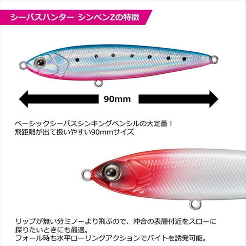 ハイコストパフォーマンスシーバスルアーの定番「シーバスハンターZ」シリーズに、食い渋り時に威力を発揮するシンキングペンシルが登場。シーバスはもとよりあらゆるフィッシュイーターに対応するスタンダード「お手軽」シンペン。ミノーを投げてもヒットが無いときは、より弱った小魚の動きに近いシンキングペンシルの出番!スローリトリーブでもしっかりとテールスイングアクションするので、使い方は投げてゆっくりとただ巻くだけでOK。フォール時も水平ローリングアクションでバイトを誘発可能。