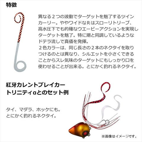 アピール力で差をつけろ!異なる2つの波動がターゲットを爆狂させる。ツインカラー&ツインカーリーシリコンネクタイ。異なる2つの波動でターゲットを魅了するツインカーリー。特にディープでのアピール力に優れていてカレントブレイカートリニティαにも搭載。細身のハイスピードツインカーリーに対し、ややワイドなRはスローリトリーブ、高水圧下でも的確なウエービーアクションを実現しターゲットを魅了。特に潮と同調しているようなドテラ流しで真価を発揮するネクタイ。2色カラーは、同じ長さの2本のネクタイを取りつけるのとは異なり、シルエットを小さくできることからスレ気味のターゲットにもしっかり口を使わせることが出来る。こだわりのチェックカラーはアミパターンなどでも真価を発揮。とにかく釣れるネクタイ。
