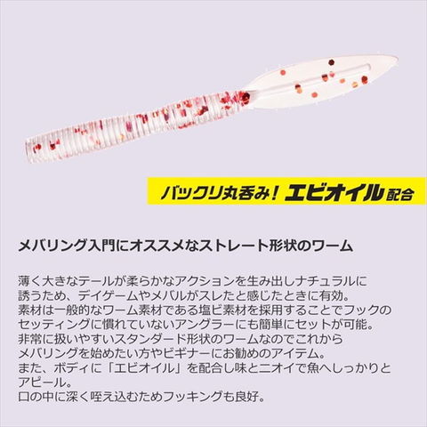 メバリング入門にオススメなストレート形状のワーム。薄く大きなテールが柔らかなアクションを生み出しナチュラルに誘うため、デイゲームやメバルがスレたと感じたときに有効。微波動を発生させるメバルハンターワーム「シャッド」と使い分け、その日にあった形状の選択がお勧め。また、素材は一般的なワーム素材である塩ビ素材を採用することでフックのセッティングに慣れていないアングラーにも簡単にセットが可能。非常に扱いやすいスタンダード形状のワームなのでこれからメバリングを始めたい方や初心者の方にお勧めのアイテム。また、ボディに「エビオイル」を配合し味とニオイで魚へしっかりとアピール。口の中に深く咥え込むためフッキングも良好。