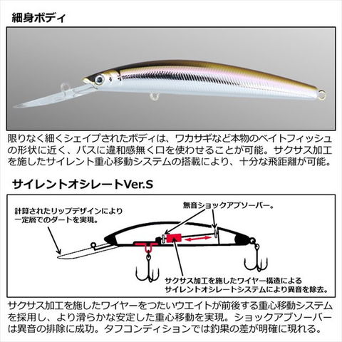 異なるレンジを攻略できる水深可変ジャークベイト。1つのルアーで異なるレンジを攻略できるミノーというコンセプトに基づき、HMKLミノーの生みの親でもある泉和摩氏の完全監修。サクサス加工を施したワイヤー構造によるサイレントオシレートVer.Sは、より滑らかな安定した重心移動を実現し、限りなく細くシェイプされたボディながら、十分なロングキャストを可能にした。