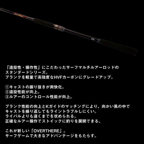 「遠投性・操作性」にこだわったサーフマルチルアーロッドのスタンダードシリーズ。ブランクを軽量で高強度なHVFカーボンにグレードアップさせたことで、キャストの振り抜きが爽快化。また、遠投性能、ルアーのコントロール性能が向上。ブランク性能の向上とKガイドのマッチングにより、向かい風の中でキャストを繰り返してもライントラブルを起こしにくくなっている。アングラーの増加が進み、ハイプレッシャー化が進むサーフ。ライバルよりも遠くまでを攻められる。正確なルアー操作でストイックに釣りを展開できる。トラブルが少ないので時間ロスがない。これが新しいOVERTHERE。サーフゲームで大きなアドバンテージをもたらす。