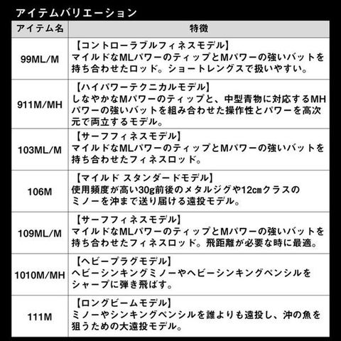 全長:3.20m 自重:177g 継数:2 仕舞寸法:164cm 先径/元径:2.1mm/15.4mm ルアー自重:10-45g、(ジグ)10-50g 適合ライン:PE0.8-2.0号 カーボン含有率:94%