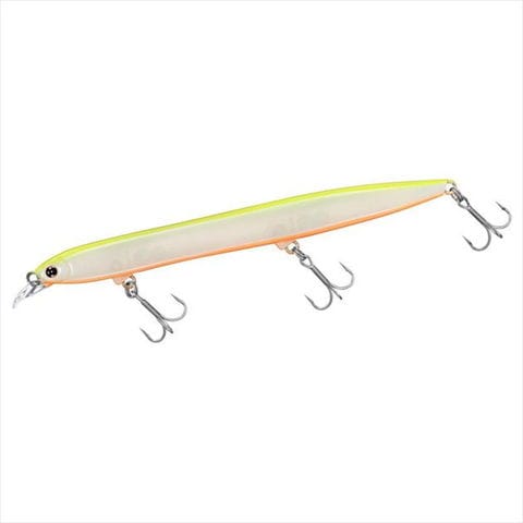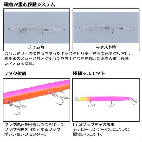 小沼正弥監修。密かに爆れ。極細シルエットの水面直下攻略型ぶっ飛びシャローランナー。細身・小型ベイトに偏食している時、激スレ時に最適な極スリムシルエット。●春先のバチ抜けから秋のサヨリパターンはもとより、季節の変わり目の複合ベイトパターンに対応●高レスポンス&スレに強いタイトウォブンロール+テールスライドアクション。低速から高速まで全てのリトリーブに対応。おとなしいタイトアクション+イレギュラースライドで低活性のシーバスを惹きつける。スロー:I字から時折わずかに震えるイレギュラー超タイトアクション。ミディアム~ファスト:タイトアクション+イレギュラースライド。●水面直下~約30cmのサブサーフェイスを攻略●矢のように飛ぶ!磁着Wウエイトオシレート搭載