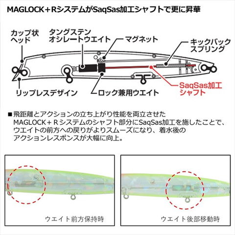 低活性・低水温期にただ巻きだけで食わす為のシャローレンジ攻略用リップレスミノー。デッドスロー対応、スローピッチフラッタリングロールアクション。幅狭スリムボディで、ヨタヨタと弱った魚の様なアクションを発生。スローピッチでおとなしいアクションによりスレたシーバス、エリアに対応。こだわりのバランス設定により、感度も高く、タダ巻きだけで流れの境目やヨレで自動的にフラッとバランスを崩し軌道変更するためそれが食わせの間となります。MAGLOCK+Rシステムのシャフト部分をSaqSas加工した「MAGLOCK Ver.S+R」の搭載により、飛距離のロスを最小限に抑えつつウエイトの戻りが大きく向上。カップ状のリップと相まって着水後のリトリーブで速やかにアクションが立ち上がる上、デッドスローリトリーブのレスポンスも秀逸。 ★ 全長:125mm 自重:15.8g 標準装備フック:♯6トレブル、♯3リング