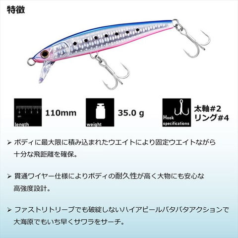 貫通ワイヤー仕様で高強度!安くて釣れるサワラ専用ハイアピールミノー!サワラ用ミノーに求められる飛距離、耐久性、アクションをしっかりと備えた専用ミノー。ボディに最大限に積み込まれたウエイトにより固定ウエイトながら十分な飛距離を確保。また、貫通ワイヤー仕様で大物にも安心な高強度設計。アクションは、ファストリトリーブでも破綻しないハイアピールバタバタアクションで大海原でもいち早くサワラをサーチ。また、サワラゲームはルアーの消耗劣化が非常に激しいが、それに臆することなくキャストしていただきたいという願いをこめて驚きの低価格設定。様々なフィールドでキャストしサワラゲームを堪能していただきたい。 ★ 全長:110mm 自重:35g フック仕様:太軸トレブルフック#2 リング仕様:♯4