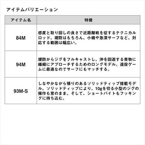 軽快な操作性を強化したスーパーライトショアジギングモデルのエントリーロッド。細いPEラインの扱いに慣れていない方に向けてマイルドなブランクを搭載。キャストのタイミングを掴みやすく、魚が急に走ってもロッドが衝撃を柔軟に受け止めて、ラインブレイクを防いでくれる。糸がらみしにくいKガイド搭載。繊細な穂先と0.6号の細いPEラインでもトラブルしにくい仕様で、軽量なジグを自在に探り、青物や根魚を魅了する。■94M・・・SLSJのセンターモデル。堤防からジグをフルキャストし、沖を回遊する青物にアプローチできる。遠投ゲームに最適なのでサーフにもマッチする。