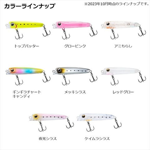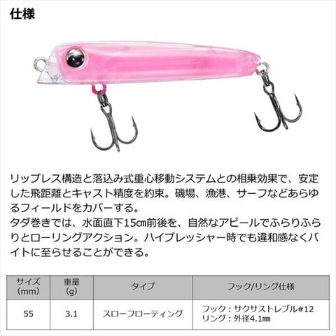 ふらり ふらりとローリングアクション。重心移動搭載リップレスミノー。リップレス構造と落込み式重心移動システムとの相乗効果で、安定した飛距離とキャスト精度を約束。磯場、漁港、サーフなどあらゆるフィールドをカバーすることができる。タダ巻きでは、水面直下15cm前後を、自然なアピールでふらりふらりとローリングアクション。ハイプレッシャー時でも違和感なくバイトに至らせることができる。また、バイトの際に弾かれにくいスローフローティング設定なので、リーリングを止めて潮流に漂わせて食わせるアプローチも可能。スローフローティングで浮き上がりにくい性能と、ふらりローリングアクションが、メバルの捕食本能を刺激し、引き寄せる。驚異の貫通力を誇るサクサストレブルフック2本仕様のため、ショートバイトが頻発する状況でもフッキングにもちこむことが可能。また、沖の表層をゆっくり引けば、ボートからのピンポイントキャストも可能。 ★ サイズ:55mm 標準自重:3.1g タイプ:フローティング 標準装備フック:サクサストレブル#12