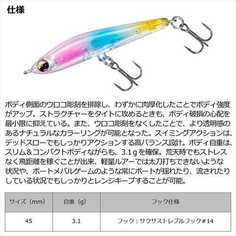 ライトゲームシーンで数々の実績を残し、いまやライトゲームにおける定番ルアーとなっている澪示威45Sをリファイン。ボディ側面のウロコ彫刻を排除し、わずかに肉厚化したことでボディ強度がアップ。ストラクチャーをタイトに攻めるときも、ボディ破損の心配を最小限に抑えている。また、ウロコ彫刻をなくしたことで、より透明感のあるナチュラルなカラーリングが可能となった。スイミングアクションは、デッドスローでもしっかりアクションする高バランス設計。ボディ自重は、スリム&コンパクトボディながらも、3.1gを確保。荒天時でもストレスなく飛距離を稼ぐことができ、軽量ルアーでは太刀打ちできないような状況や、ボートメバルゲームのような常にボートが揺れたり、流されたりしている状況でもしっかりとレンジキープすることが可能。 ★ サイズ:45mm 標準自重:3.1g タイプ:シンキング 標準装備フック:#14 標準装備リング:♯00