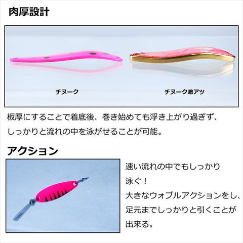 流れをとらえ、しっかり泳ぐ!速い流れの中でしっかり底を取ることが出来る。着底後、巻き始めても浮き上がり過ぎず、しっかりと流れの中を泳がせることが可能。特に流れの速い中規模河川での出番が多くなるスプーン。止水での使用ももちろん可能で、大きなウォブルアクションをし、足元までしっかりと引くことが出来る。