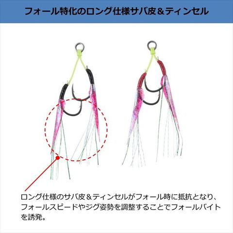 フォールで魅せてバイトを誘発!ロング仕様サバ皮&ティンセル搭載のフォール特化SLJフック。ソルティガアシストSS SLJのフォール特化仕様が登場。従来品より長いサバ皮・ティンセルがフォール時の抵抗となり、水平フォールを演出しバイトを誘発する。スローフォールが効く場面や、ジャーク後のステイで特に効果を発揮する。オーロラピンクのサバ皮とグリーン系2種のティンセルはアピール抜群。イサキ、根魚、真鯛、青物と様々なターゲットを魅了。段差仕様のアシストラインは、ジグとの絡みを抑えてバイトを逃さない。