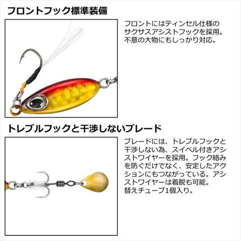 岩崎林太郎(りんたこ)監修。ターゲットは無限大!ミドルゲームに最適な小粒ブレードジグ!ミドルゲームとは、ライトゲームより少し強いタックルでマダイや根魚、フラットフィッシュ等々。様々な魚種をショアから狙うのがコンセプト。それがミドルゲーム。雫のような形状は後方重心の為、安定した飛距離を実現。トレブルフックの後ろに小型ブレードを装着。ただ巻きで広範囲のターゲットにアピールすることが出来る。また、ヒラヒラと落ちるスローフォールアクションとフォール中でもしっかり回転するブレードは喰わせ能力を格段に向上させている。フロントにはティンセル仕様のサクサスアシストフックを採用。不意の青物にもしっかり対応。リアにはトレブルフックを採用することで、様々なターゲットをフッキングに持ち込むことが可能に。