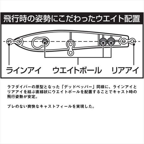 ミスバイトを減らし、深いバイトを生むダイビングタイプ。アクション時、水中に頭を深くダイブさせるダイビングタイプのペンシルベイト。水絡みが良いため、アップストリームでの操作時など、通常のタイプだと上滑りしてフッキングが決まりにくい状況でも、ミスバイトを減らすことができる。また、低活性や低水温にも強く、ルアーの後方を追うだけでなかなかバイトに至らない状況でも深いバイトを生みフッキングに至らせることができる。ドッグウォークが得意なラフトリックとダイビングアクションが得意なラフダイバーのローテーションで、様々な状況への対応力が大幅に向上した。