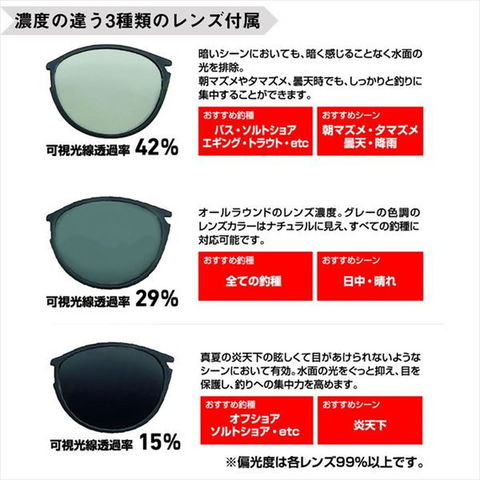 天候やフィールドに合わせて、自分でレンズ交換可能な偏光グラス。自分でレンズ交換が可能な偏光グラス。天候やフィールドに合わせて使える濃度の違う3種類のレンズを付属。軽量(約18g)でかけやすいプラスチックフレーム、固定式鼻パッド、傷が分かりづらいマットブラックカラーを採用。デザインについては、フィールドでもフィールド以外でも使いたくなるような、カジュアルファッションの雰囲気を汲んだボストンモデル。丸い形状は、どんな顔の形でも合いやすく、女性でもかけやすいデザイン。 ★ 偏光度:99% レンズ巾:50mm レンズ:トリアセテート フレーム:TR-90(ナイロン) 付属品:メガネポーチ袋、2種類レンズが入るレンズケース、全てが収納可能なメガネケース ※実物と色が違って見える場合があります。あらかじめご了承下さい。