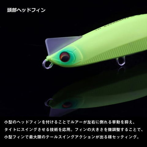 ヒラメ&マゴチからシーバス、青物まで幅広く狙える、超ぶっ飛びのバーサタイルヘビーシンキングペンシル!スローリトリーブではヒラメ&マゴチ、シーバスに有効なワイドテールスイングアクション、高速リトリーブでは青物に有効なイレギュラーローリングアクションにシフトチェンジ!圧倒的な飛距離を実現!