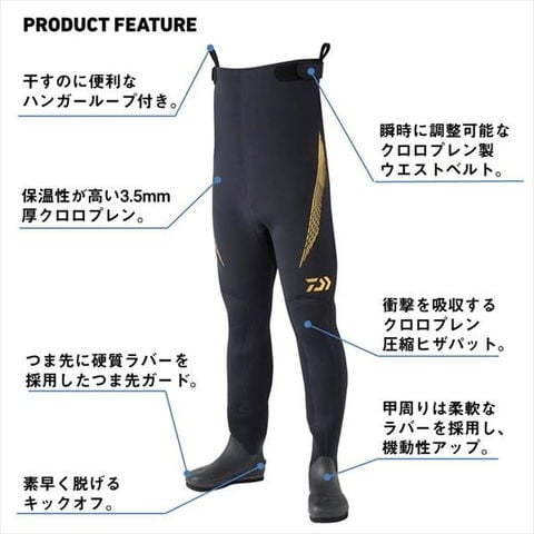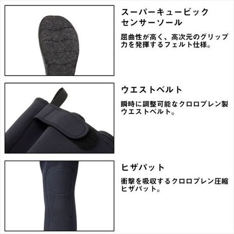 高機能スタンダードスリムウェーダーがさらに使いやすくリニューアル。前モデルより更に3cmの股上の長さをアップ!上からの水の浸入を防ぎ、より立ちこめる仕様に。保温性と防護性の高い3.5mm厚クロロプレン。屈曲性が高く、高次元のグリップ力を発揮するスーパーキュービックセンサーソール(フェルトソール)。甲周りは柔軟なラバーを採用し、機動性アップ。背中側の履き口を高くし、より立ちこみに有利なハイバックカット仕様。膝には、厚いクロロプレンを圧縮した膝パッド採用。膝の可動を邪魔しないデザインになっており、おとり交換の際にも安心して膝をつけられる。つま先に硬質ラバーを採用したつま先ガード。瞬時に調整可能なクロロプレン製ウエストベルト。干すのに便利なハンガーループ付き。素早く脱げるキックオフ。スタンダードウェアにも、鮎SPウェアにも合うゴールドカラーの鮎師向けデザイン。 ★ サイズ:SA-S