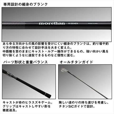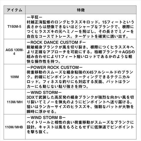 ヒラスズキゲームの可能性をさらに広げるベイトロッド。■110M/MHB(WIND STORM BAIT)・・・ベイトリールと相性の良い荷重移動がスムーズなブランクに設計。キャストは風をもろともせずに低弾道でピンポイントを撃ち抜くのはもちろん、ピンポイントにルアーをそっと置いてくるようなキャストも自在に操る。ファイトにおいては、ロッドの強い粘りとベイトリールならではの巻きパワーで、ランカーヒラスズキや青物を瞬時に浮かせる。
