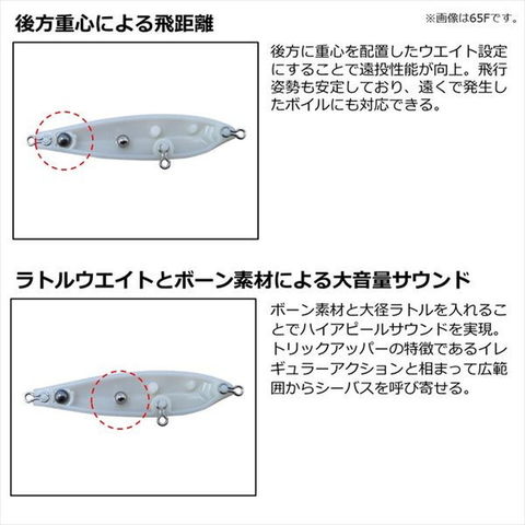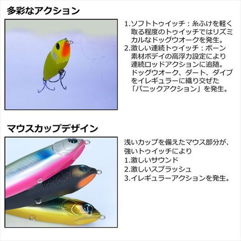 飛び、動き、集魚力の三拍子を高次元で実現。◆メインウエイトを後方に配置したことで驚異的な飛距離を実現。◆トゥイッチを入れると、ダイブと共にイレギュラーなダートを見せ、スプラッシュ音や小さなポップ音、内蔵されたラトルがランダムにサウンドを奏で、高い集魚力を発揮。◆ボディにはボーン素材を採用。これにより、浮力が強くキビキビとしたアクションの実現、高音域ラトルサウンドの発生を実現している。◆チニングにもオススメできるサイズ感