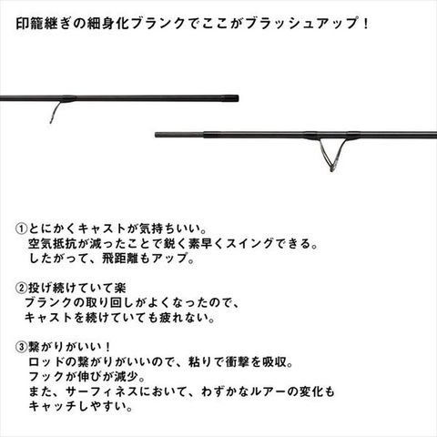 「遠投性・振り抜き・感度」のすべてを徹底的に磨き上げ、サーフのルアーゲームでの高いパフォーマンスを実現。細身で高反発なブランクが生み出す爽快なキャストフィールと、驚異の遠投性能。軽さがもたらす高い感度と操作性が、サーフゲームで大きなアドバンテージをもたらす。■106MHB(ヘビープラグモデル)・・・ヘビーシンキングミノーやヘビーシンキングペンシルの遠投で沖のブレイクを攻めるハイパワーなサーフ用ベイトロッド。ラインの太さに飛距離を左右されにくいベイトタックルのメリットを生かし、沖に潜む大物へ強気のアプローチを実現する。