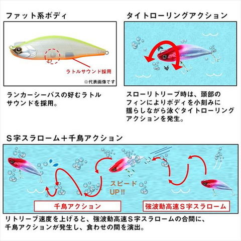 ダイワシンペンの代名詞「Lazy」シリーズ。タイトローリング&ワイドS字スラローム2WAYアクションのぶっ飛びファットシャッドシンペン。■タイトローリング&ワイドS字スラローム2WAYアクション。■スローリトリーブでは頭部フィンによりタイトローリング。■ノーマルではワイドS字スラロームアクションにシフトUP。■ランカーシーバスの好むラトルサウンド