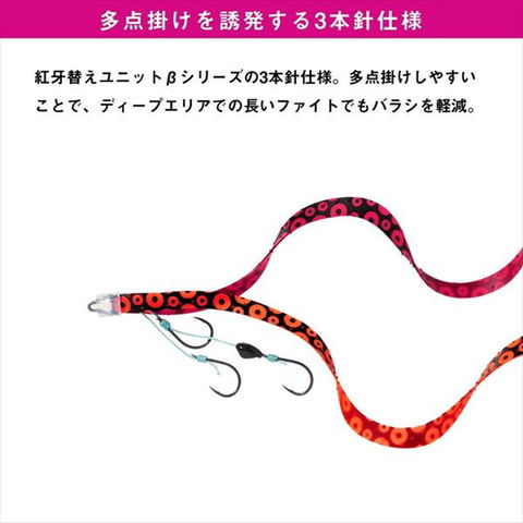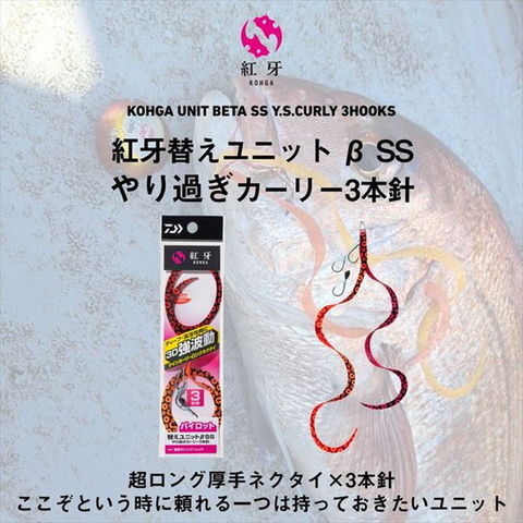 超ロング厚手ネクタイ×3本針!ここぞという時に頼れる一つは持っておきたいユニット!ダイワ独自の3D素材を採用したかつてない超ロングネクタイの「紅牙シリコンネクタイ3Dやり過ぎカーリー」と3本針を採用した替えユニット。特にディープエリア・高活性時の鯛に有効な仕様とすることで、ここぞという時に頼れるユニットとなっている。