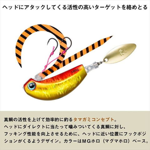 中井一誠が提唱する新メソッド「玉噛みコンセプト」を具現化した鉛製タイラバヘッド。中井一誠氏が提唱する、「真鯛の活性を上げて効率的に釣る」タイラバ新メソッド「玉噛みコンセプト」。ヘッドにダイレクトに当たってくる真鯛に対し、フッキング性能を向上させるために、ヘッドに近い位置にフックポジションがくるように新たにデザイン。タングステンとは異なる比重で使い分けることで更なる釣果アップ。MGホロ(マグマホロ)ベースでPHホロベースのタングステンとは、一瞬で区別可能。玉噛みコンセプト対応タイラバセット。ブレードを使って真鯛の活性を上げ、ヘッドに噛みつかせるようにして掛けていく玉噛みコンセプト。比重特性を活かしてしっかりフォールで魅せて、追わせるブレード付きタイラバセット。ボディ形状は専用デザインを採用し、ネクタイユニットとの絡みを軽減したトラブルフリー構造。安心のサクサスフック採用で優れたフッキング性能を発揮。