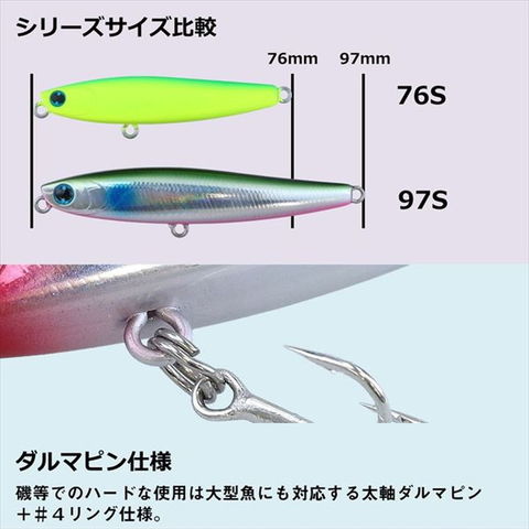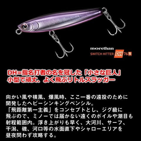 小沼正弥監修。「DH=指名打者」の名を冠した「飛距離第一主義」のホームランバッター。向かい風や横風、爆風時、ここ一番の遠投のために開発したヘビーシンキングペンシル。「飛距離第一主義」をコンセプトとし、ジグ級に飛ぶので、ミノーでは届かない遠くのボイルや潮目も射程範囲内。浮き上がりも早く、大河川、サーフ、干潟、磯、河口等の水面直下やシャローエリアを昼夜問わず攻略する。 ★ 全長:76mm