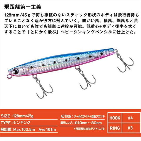 「フィールドを選ばない、誰でも飛距離が出る、誰でも扱い易い」レーザーインパクト搭載。DH=指名打者の名を冠した「飛距離第一主義」のDHシリーズに128mm/45gのブッ飛びモデル登場!「向かい風、横風、爆風」など荒天下においても安定感抜群の飛行姿勢で誰でも簡単に遠投が可能。ルアーの届かない沖のボイルや潮目は攻略不可能で、ただ眺めることしかできない。この状況を打開するにはとにかく飛ぶことで、DH128S-LIはこの課題を克服するために誕生した。アクションはテールスライドアクション。リップ付きルアーの水流を嫌がるスレた河川のシーバスから回遊性の高い外洋シーバスまで幅広く対応できる。浮き上がりは早く設定。スローに誘うことができ、大河川、サーフ、干潟、磯、河口等のシャローエリアを昼夜問わず攻略が可能。イナッコだけでなく、コノシロ、マイワシ、鮎、サヨリ、ハタハタなど様々なベイトに対応。使い方も豊富で、ただ巻き、リフト&フォール、ストップ&ゴーなど様々な釣り方に対応でき、場所や状況も選ばない。
