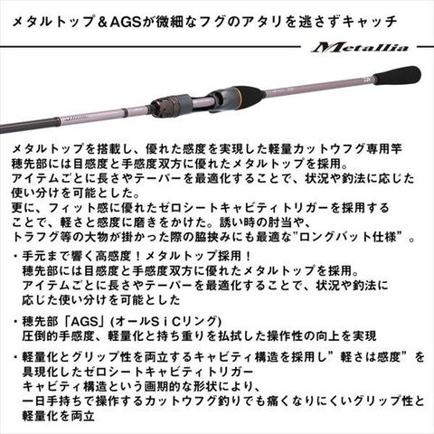 MT&AGSが微細なフグのアタリを逃さずキャッチ。全国のカットウフグを網羅する3アイテムをラインナップ。メタルトップを搭載し、優れた感度を実現した軽量カットウフグ専用竿。穂先部には目感度と手感度双方に優れたメタルトップを採用。アイテムごとに長さやテーパーを最適化することで、状況や釣法に応じた使い分けを可能とした。更に、フィット感に優れたゼロシートキャビティトリガーを採用することで、軽さと感度に磨きをかけた。誘い時の肘当や、トラフグ等の大物が掛かった際の脇挟みにも最適なロングバット仕様。■S/H-175・・・しなやかなメタルトップと長い全長を活かした仕掛けの安定力が魅力のテクニカルモデル。全長(m):1.75