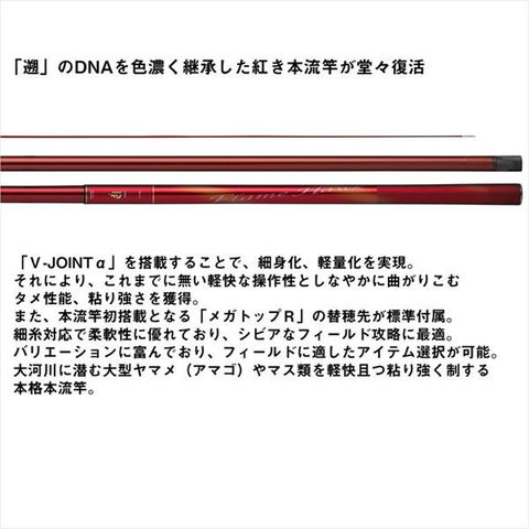 「V-JOINTα」が生み出す強靭なパワーと粘りを実現。本流竿初搭載「メガトップR」替穂先で大型マス類を攻略する本格本流竿。「遡」のDNAを色濃く継承した紅き本流竿が堂々復活。遡フレイムホーク史上初の「V-JOINTα」を搭載することで、強靭なパワーと粘りを備えながら、細身化、軽量化を実現。また、本流竿初搭載となる「メガトップR」の替穂先が標準付属。柔軟性に優れ、細糸に対応し、低活性時やスレた状況に最適。アイテムバリエーションに富んでおり、フィールドに適したアイテム選択が可能。大河川に潜む大型ヤマメ(アマゴ)やマス類を軽快且つパワフルに制する本格本流竿。全長:9.00m