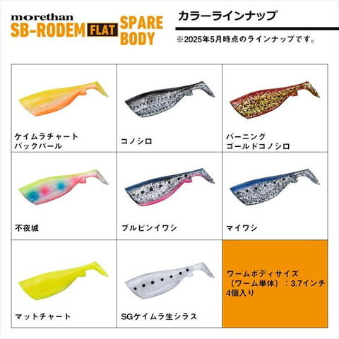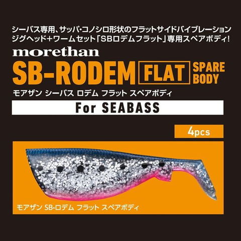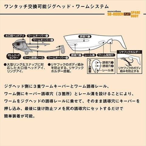 シーバス専用、サッパ・コノシロ形状のフラットサイドバイブレーションジグヘッド+ワームセット「SBロデムフラット」専用スペアボディ!誘導穴・誘導溝つきワームボディ採用によりワンタッチでボディ交換可能!貴重なチャンスを逃さない!●「ワンタッチ交換可能ジグヘッド・ワームシステム」ジグヘッド側に3重ワームキーパーとワーム誘導レール、ワーム側にキーパー誘導穴(3箇所)とレール溝を設けることにより、ワームをジグヘッドの誘導レールに乗せて、そのまま誘導穴にキーパーを押し込み、最後に抜け防止ツメを尻のワーム保持穴にセットするだけで簡単装着が可能!●「ダックフィンテール搭載ソフトマテリアルワームボディ」水鳥の足ヒレ形状からヒントを得た「ダックフィンテール」を搭載。その独特の形状は水つかみが良く振り子状に大きく左右にスイングする為、強いバイブレーション&ロールアクションを発生。●リヤフックのボディ絡みを防止する、リヤフックホルダー搭載。
