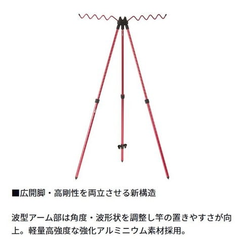高安定・高剛性 ダイワの三脚。広開脚と高剛性を両立させる新構造により一層安定性が向上。脚部は上部が細く下部が太い逆テーパー形状、異物や砂を噛みこみにくい設計。波型アーム部は角度・波サイズを調整し竿の置きやすさが向上。軽量高強度な強化アルミニウム素材採用。脚の長さはワンタッチレバーで簡単に調整可能。脚の先端は新形状スパイクピンを採用することで、地面への食い付き性能が向上。収納時に3本の脚をまとめる脚ホルダー兼スパイクカバーは脱落や紛失が無い構造。強靭な水汲みバケツ用ステンレスフック採用メンテナンスに便利なパイプ排水穴付き。収納・保管に便利なメッシュバッグ付き。