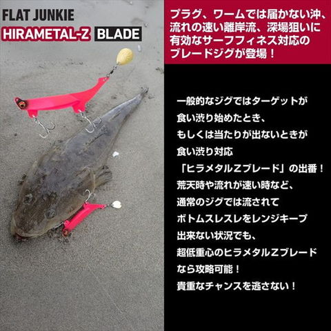 プラグ、ワームでは届かない沖、流れの速い離岸流、深場狙いに有効なサーフフィネス対応のブレードジグが登場!ジグ本体はノーアクション!テールに装着されたブレードから発生される「無防備な状態で泳ぐイワシのような波動」のみで誘うことにより、食い渋りの座布団ヒラメも思わずバイト!ルアーを横から見るとゆったりと泳ぐ小型イワシのシルエット、後ろからはブレードの回転シルエットのみでジグ本体からの波動は出ないため、食い渋りターゲットも警戒心を解く!一般的なジグではターゲットが食い渋り始めたとき、もしくは当たりが出ないときが食い渋り対応「ヒラメタルZブレード」の出番!荒天時や流れが速い時など、通常のジグでは流されてボトムスレスレをレンジキープ出来ない状況でも、超低重心のヒラメタルZブレードなら攻略可能!貴重なチャンスを逃さない!全長(mm):87