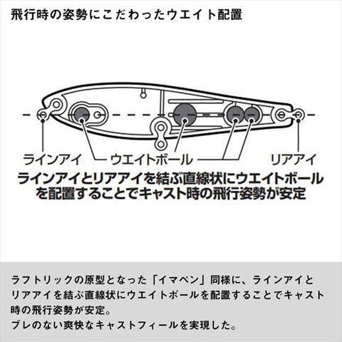 広大な都市河川の河口域を素早くサーチするチニング専用大型ペンシル。従来のチニング用プラグとは一線を画す、大型サイズのチニング専用ペンシルベイト。広大な河口域では、広範囲をカバーできる飛距離と水押しによるアピール力が重要。荒れた状況でも、快適にキャストできる自重と安定したアクションを実現するウエイトバランスで従来サイズのプラグでは攻略できなかった状況でも快適に釣りをすることが可能となった。サイズは70mmと90mmの2サイズをラインナップ。いずれのサイズも一般的なチニング用ペンシルよりも大型サイズのため、従来のものとは一線を画す大遠投、ハイアピール仕様。また、サイズ感ゆえ、一見、フッキングが悪い印象を与えるかもしないが、フッキング性能を高めるため、浮き姿勢やフックセッティングにもこだわり、サイズを感じさせないフッキング率を実現した。 ★ 全長:70mm