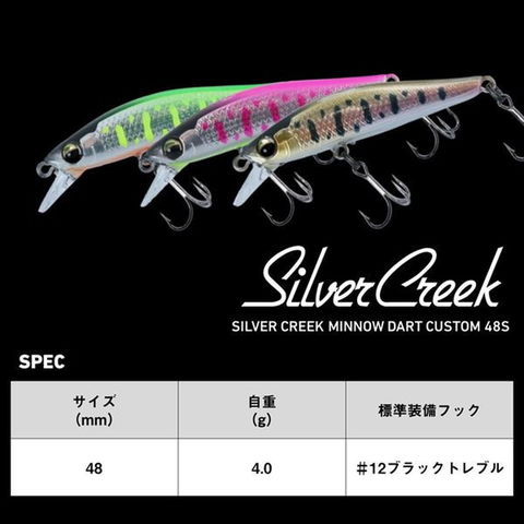 キレのあるダートアクションで追尾したトラウトを 左右に揺さぶりスイッチを入れる!◆48S・・・シルバークリークミノーダートカスタムはその名の通りダートアクションを得意としているミノー。ショートトゥイッチでは素早く頭を左右に振るクイックターンし、素早く、細かいアクションが魚の捕食スイッチを入れる。通常のトゥイッチでは大きく左右にアクションし、ワイドターンをする。流れの中でルアーが一瞬止まったかの様に見え、そのタメが喰わせの間を作る。