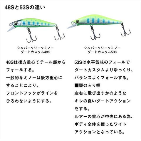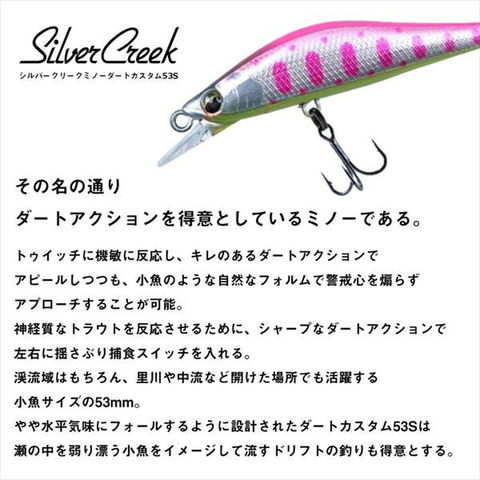 キレのあるダートアクションで追尾したトラウトを 左右に揺さぶりスイッチを入れる!◆53S・・・シルバークリークミノーダートカスタムはその名の通りダートアクションを得意とする。トゥイッチに機敏に反応し、キレのあるダートアクションでアピールしつつも、小魚のような自然なフォルムで警戒心を煽らずアプローチすることが可能。神経質なトラウトを反応させるために、シャープなダートアクションで左右に揺さぶり捕食スイッチを入れる。渓流域はもちろん、里川や中流など開けた場所でも活躍する小魚サイズの53mm。やや水平気味にフォールするように設計されたダートカスタム53Sは瀬の中を弱り漂う小魚をイメージして流すドリフトの釣りも得意とする。