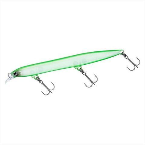 小沼正弥監修。密かに爆れ。バチ、サヨリ、シラス、激スレパターン対応、極細シルエットの水面直下攻略型ぶっ飛びシャローランナー。細身・小型ベイトに偏食している時、激スレ時に最適。バチ、サヨリ、シラスはもとより、イワシや稚アユ等の小型ベイトパターンにベストマッチな極スリムシルエット。高レスポンス&スレに強いタイトウォブンロール+テールスライドアクションで、低速~高速まで全てのリトリーブに対応。ロッドポジションとリトリーブ速度の組み合わせで水面直下~約30cmが有効レンジ。風雨等でI字系スリムプラグが太刀打ちできない状況でも、一枚下のレンジでしっかりアピールできる。極細ボディながら磁着重心移動を前後にダブルで搭載し、「スリムミノーは飛ばない」イメージをくつがえす快適なキャスタビリティと立ち上がり性能を両立。