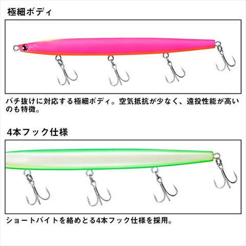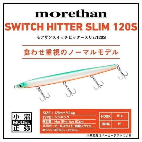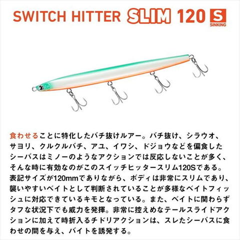 小沼正弥監修。「食わせ重視」の120S。スイッチヒッタースリム120Sは「食わせる」ことに特化したバチ抜けルアーであり、シーバスが特定のベイトに偏食している状況で効果を発揮する。スリムなボディは多様なベイトフィッシュに対応し、控えめなテールスライドアクションと時折入るチドリアクションが、スレたシーバスに食わせの間を与える。