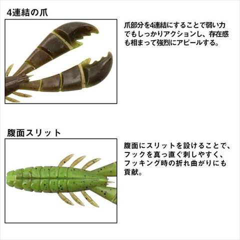 バタバタ動く爪で魚の本能を刺激するハイパワージョイントクローワーム。シャローの近距離戦を得意とするクローワーム。4連結ジョイント構造の爪は、着水直後からアクションを始め、艶めかしくもバタバタ水を強く掻き、魚へ強烈にアピールする。また、ジョイントのおかげで着底からの倒れ込みは爪が遅れて倒れバイトチャンスを誘発させる。大ぶりな爪は、フリップやピッチングの際に振り子の役目を果たし、ストレスなくキャストすることが可能となっている。琵琶湖ガイド 島後英幸監修。4連結ジョイント構造の爪で着水から着底まで常にアピール。爪側にもウエイトがありフリップorピッチングしやすいネイルを刺せばバックスライドにも対応 ★ 全長:3.9inch