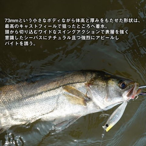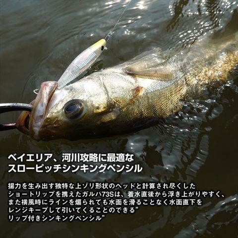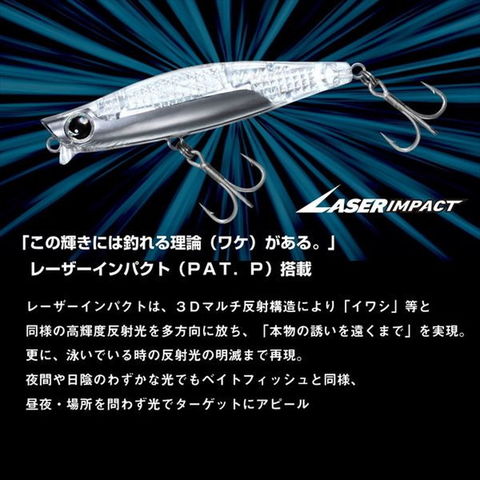 大野ゆうき監修モデル。ベイエリア、河川攻略に最適なスローピッチシンキングペンシル「ガルバ73S」が、レーザーインパクト搭載でブラッシュアップ!レーザーインパクトは、3Dマルチ反射構造により「イワシ」等と同様の高輝度反射光を多方向に放ち、「本物の誘いを遠くまで」を実現。更に、泳いでいる時の反射光の明滅まで再現。夜間や日陰のわずかな光でもベイトフィッシュと同様、昼夜・場所を問わず光でターゲットにアピール。